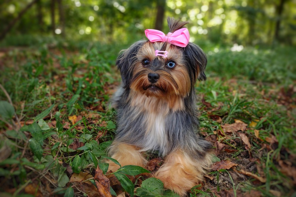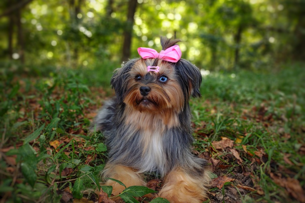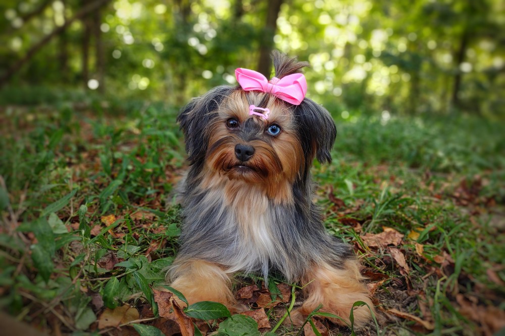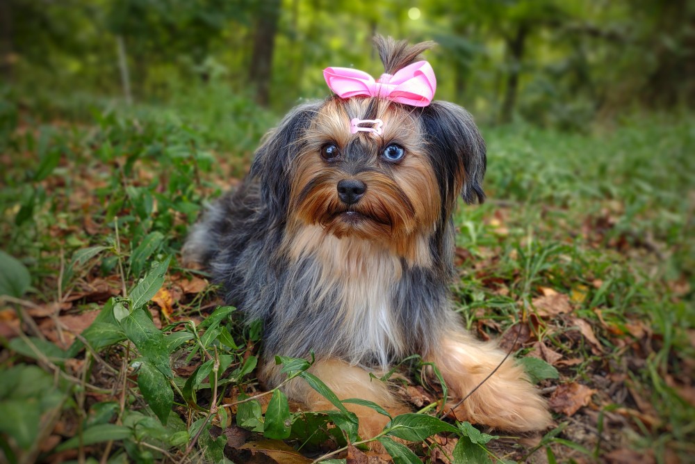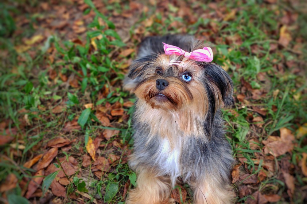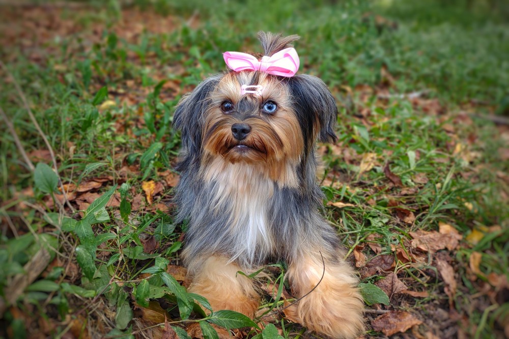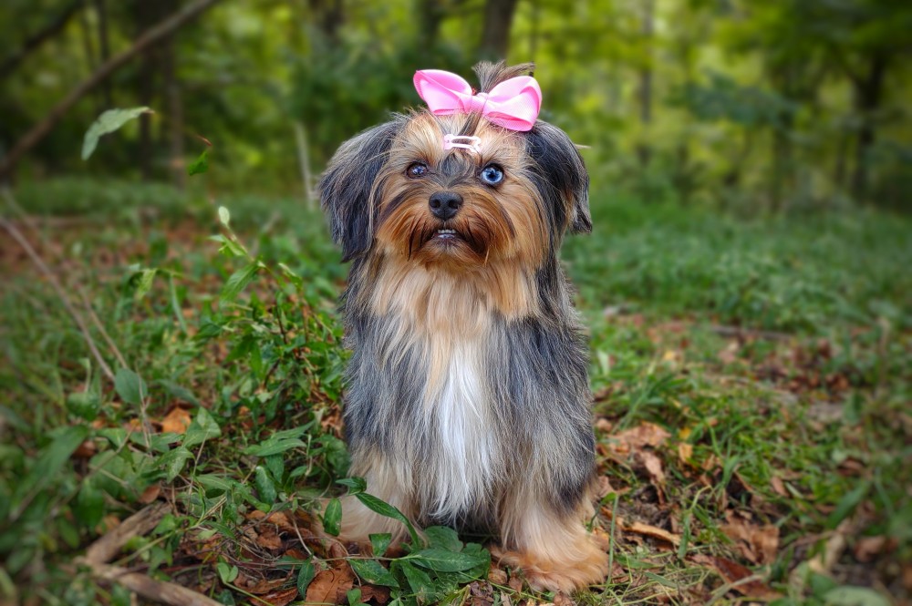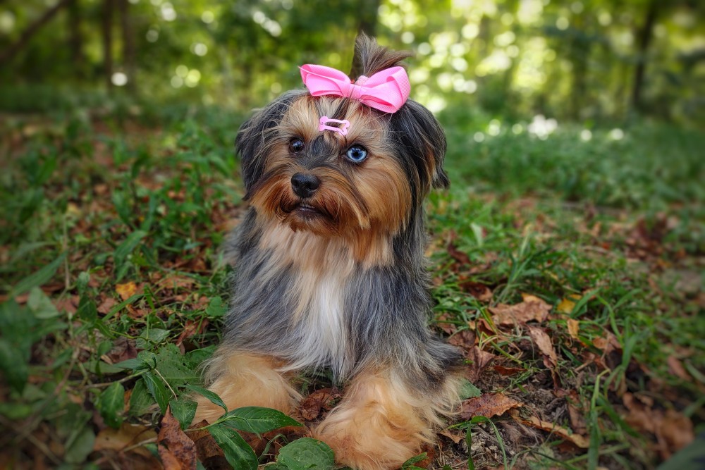 GENERAL INFORMATION: Breed: Yorkshire Terrier Gender: Female Weight: 9lbs Height: 9" Date of Birth: 6/12/2021 Color: Tan Point Merle Personality Type: Sociable-Friendly with Gentle-Cooperative tendencies