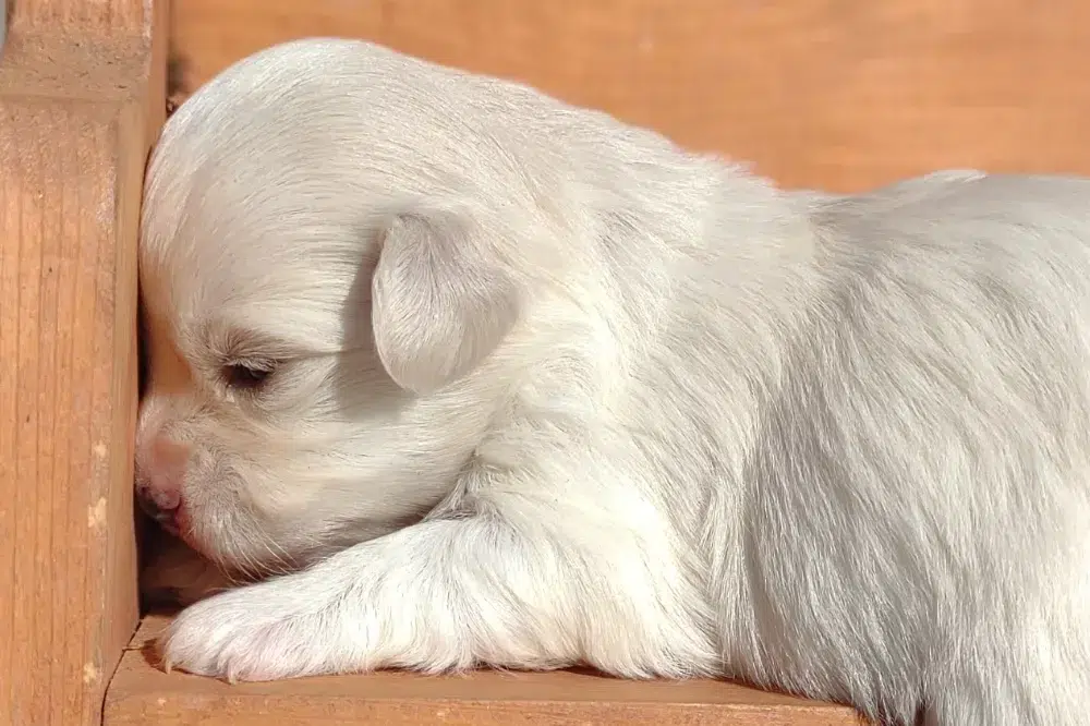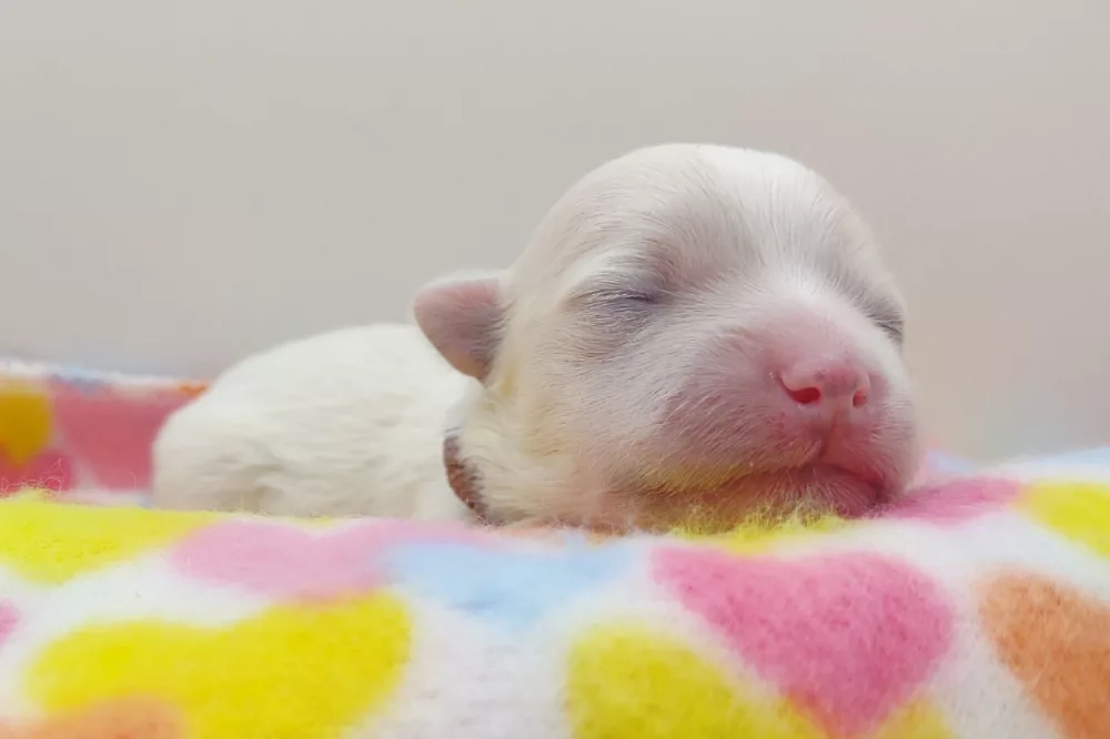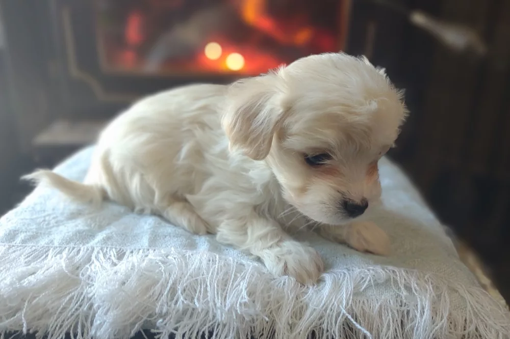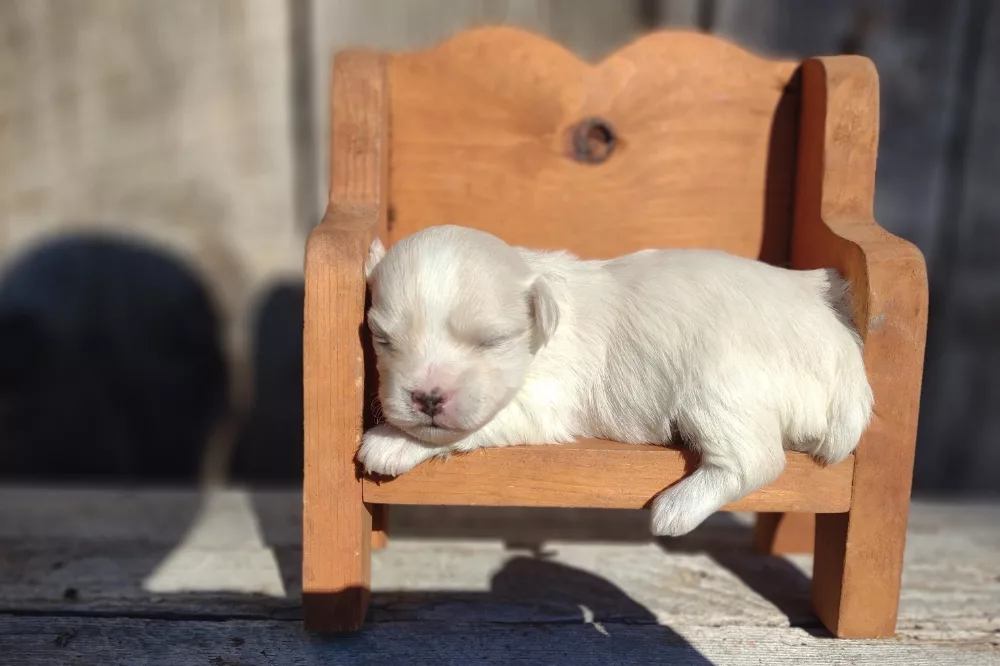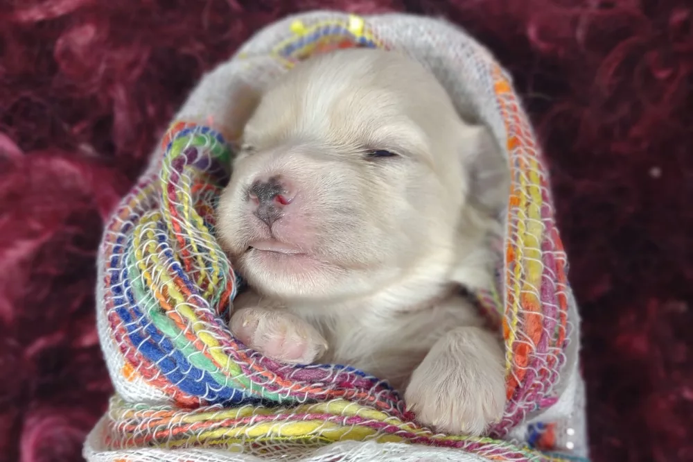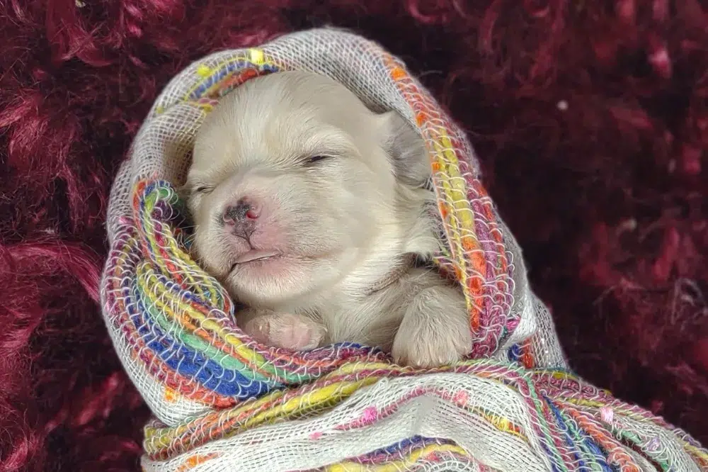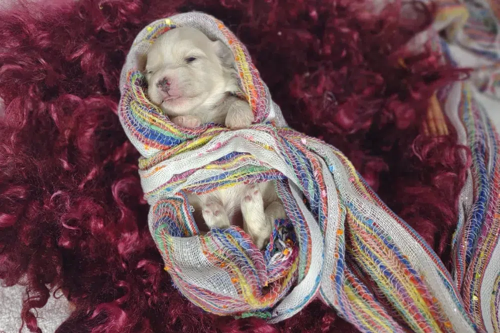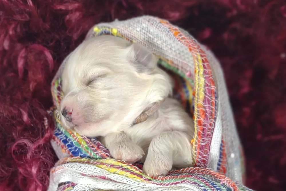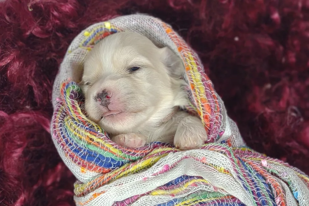Taffy was the second-born of her litter and she was born at a healthy average-size for a newborn Havamalt puppy! She was happily nursing from her mama within 14 minutes of birth. She has been gaining weight steadily since birth, and is currently thriving! Taffy arrived looking like a solid white puppy, but it became evident fairly quickly that she is white and cream. Our best guess is she will stay white & cream as she matures. Because Mama is a Havanese, we can only make an educated guess. After all, Havamalts are like a box of chocolates! You never know what you are gonna get! Taffy has a lavender collar so you can easily pick her out in pictures and videos. Taffy's personality test revealed that she has a Gentle-Cooperative personality, which is exactly what we have guessed for a while now based on observing her with her litter mates and our family.
