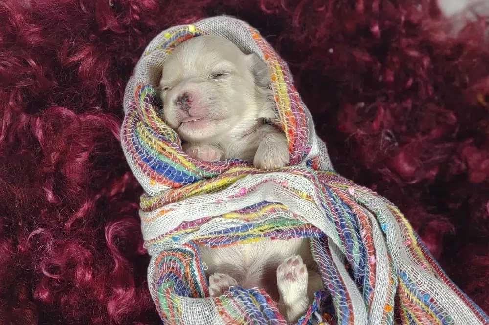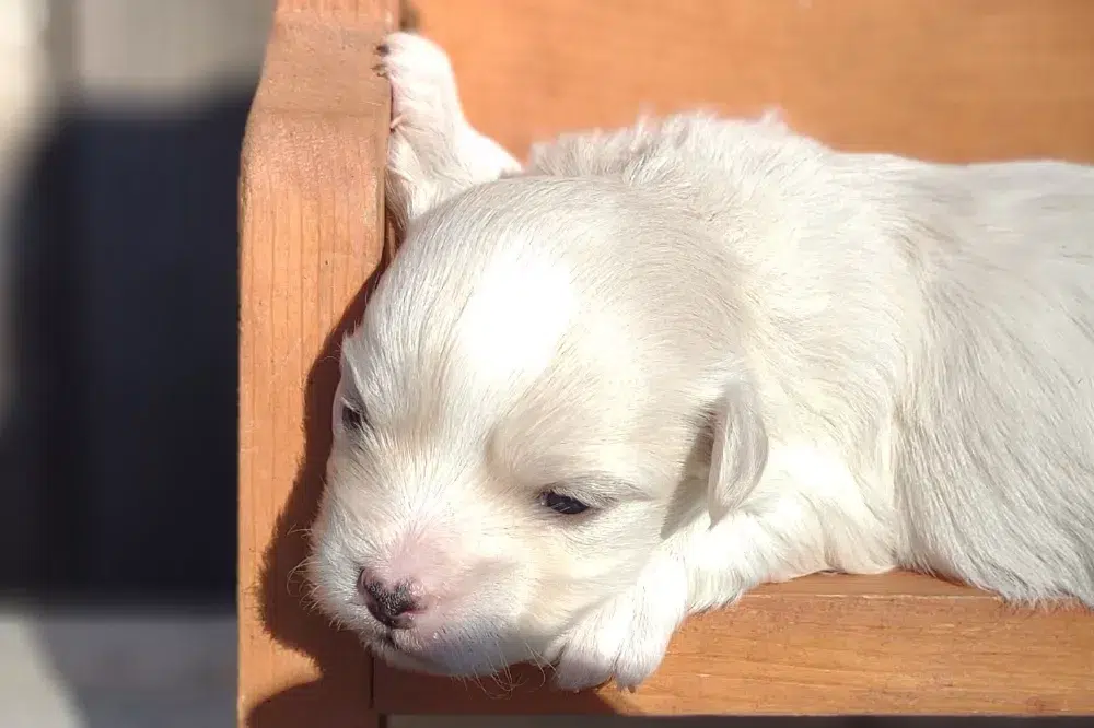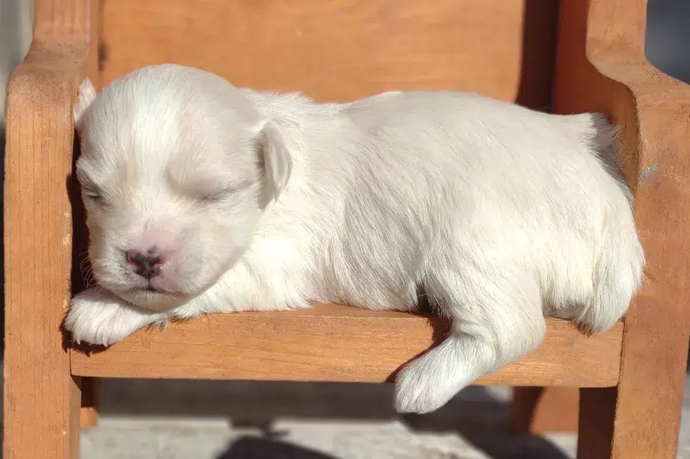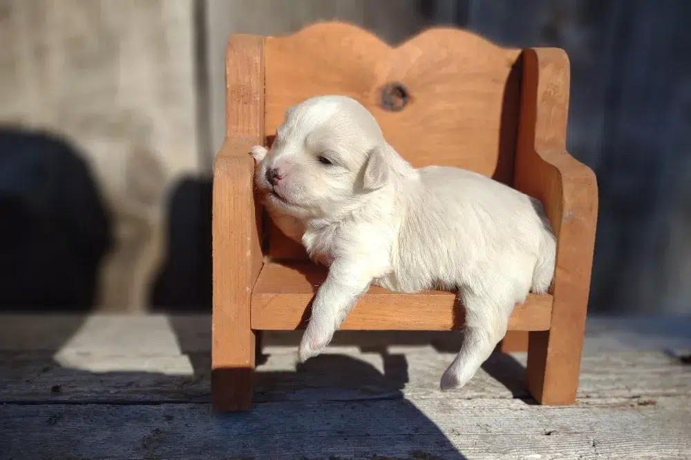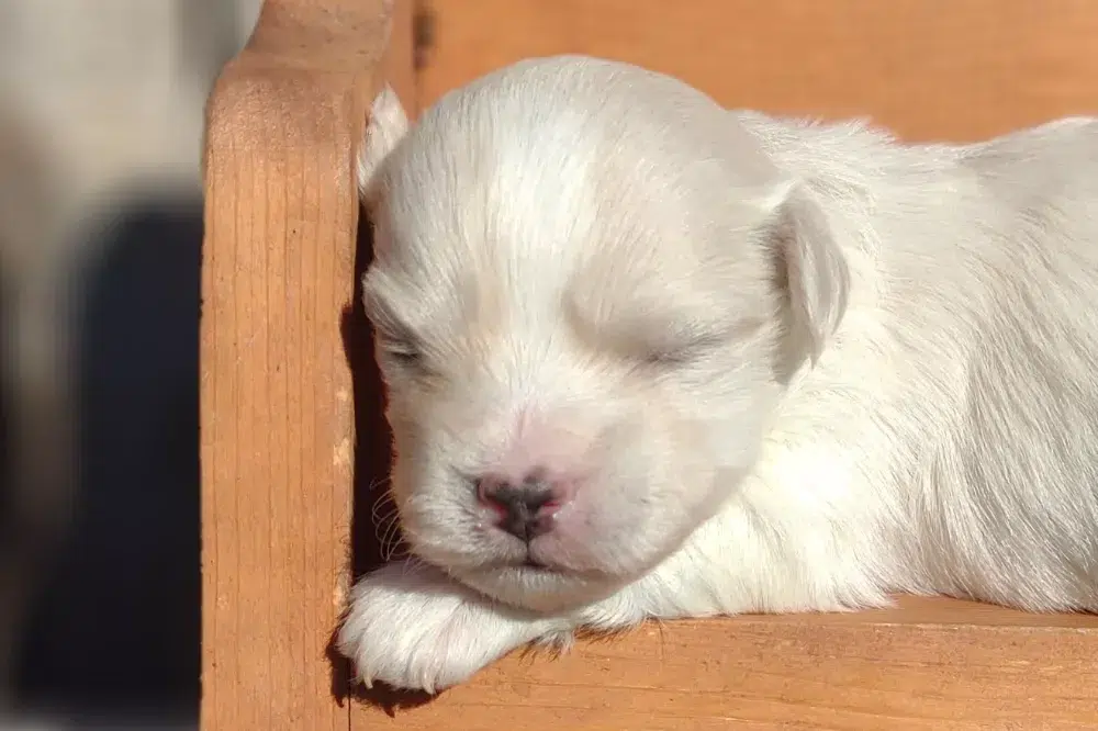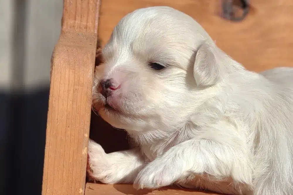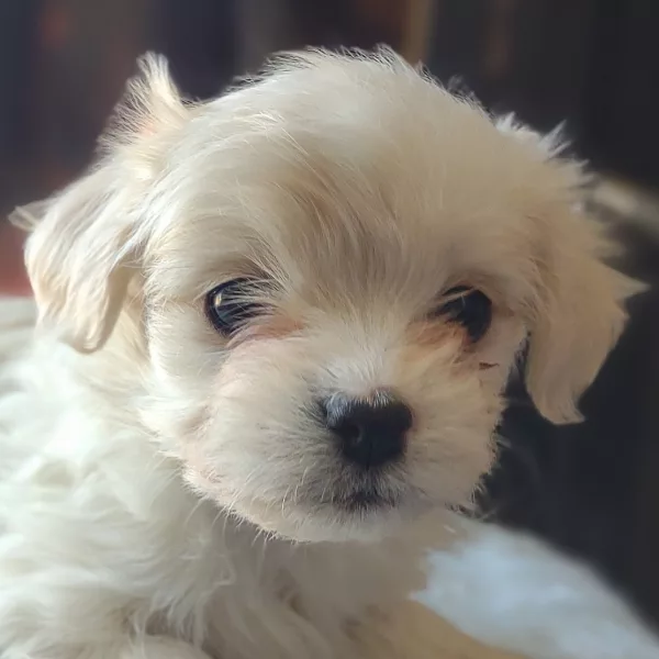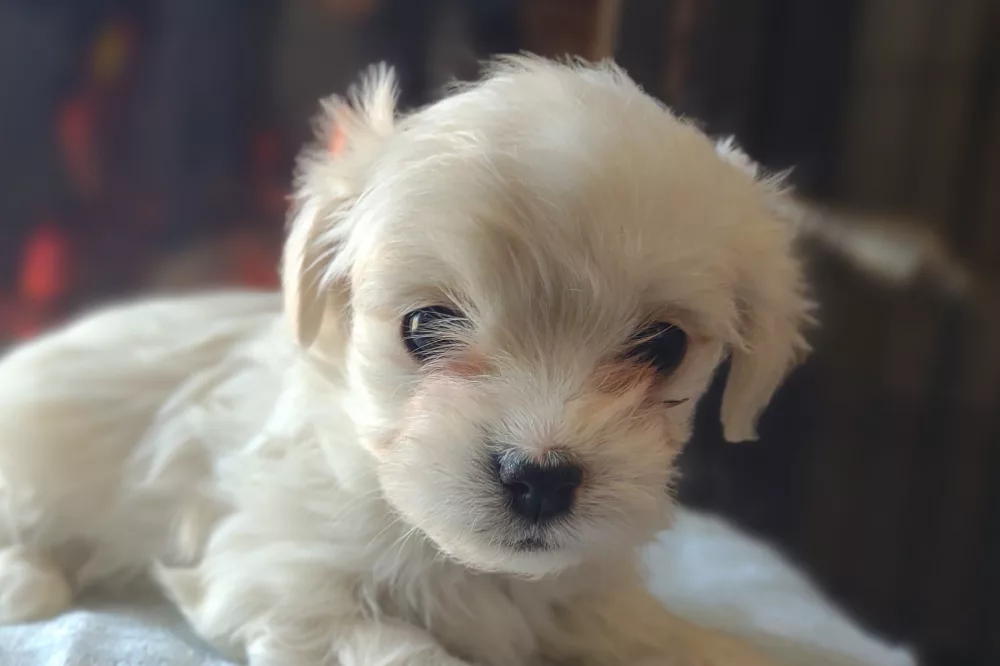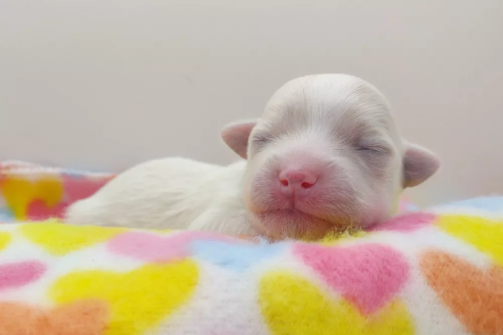 Taffy was the second-born of her litter and she was born at a healthy average-size for a newborn Havamalt puppy! She was happily nursing from her mama within 14 minutes of birth. She has been gaining weight steadily since birth, and is currently thriving! Taffy arrived looking like a solid white puppy, but it became evident fairly quickly that she is white and cream. Our best guess is she will stay white & cream as she matures. Because Mama is a Havanese, we can only make an educated guess. After all, Havamalts are like a box of chocolates! You never know what you are gonna get! Taffy has a lavender collar so you can easily pick her out in pictures and videos. Taffy's personality test revealed that she has a Gentle-Cooperative personality, which is exactly what we have guessed for a while now based on observing her with her litter mates and our family.
