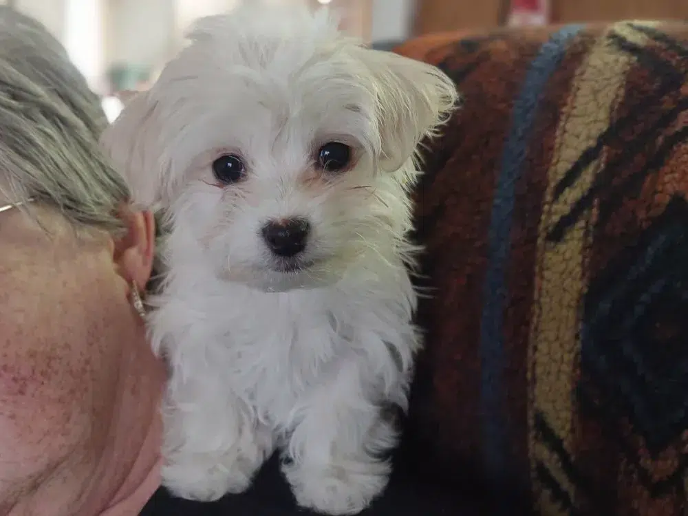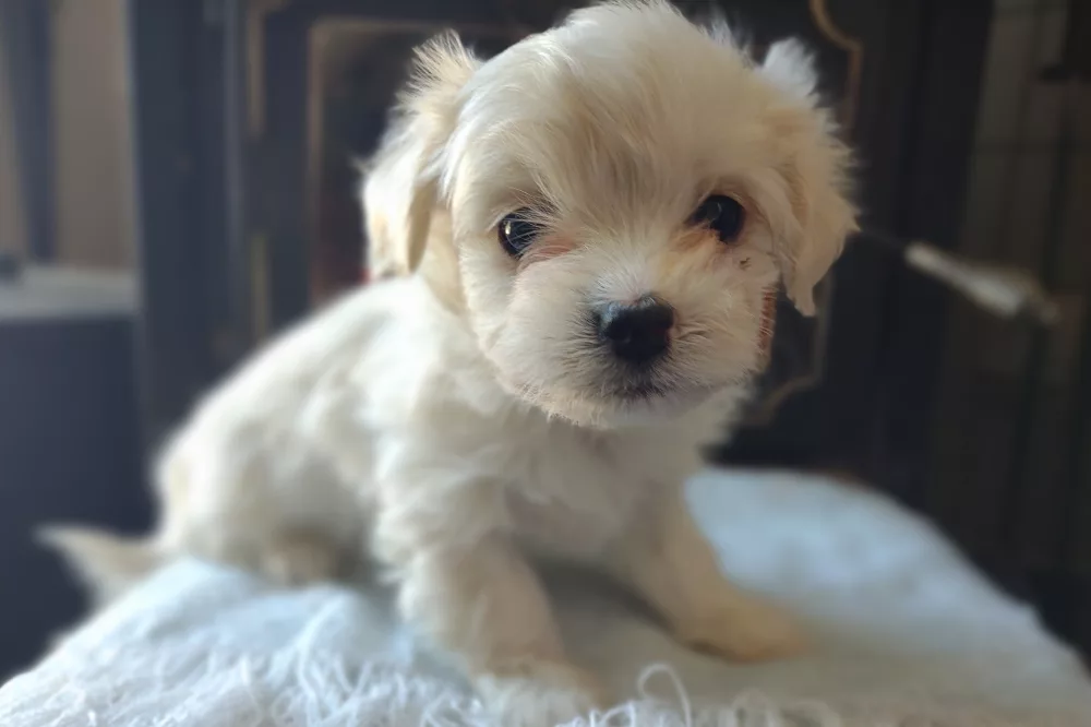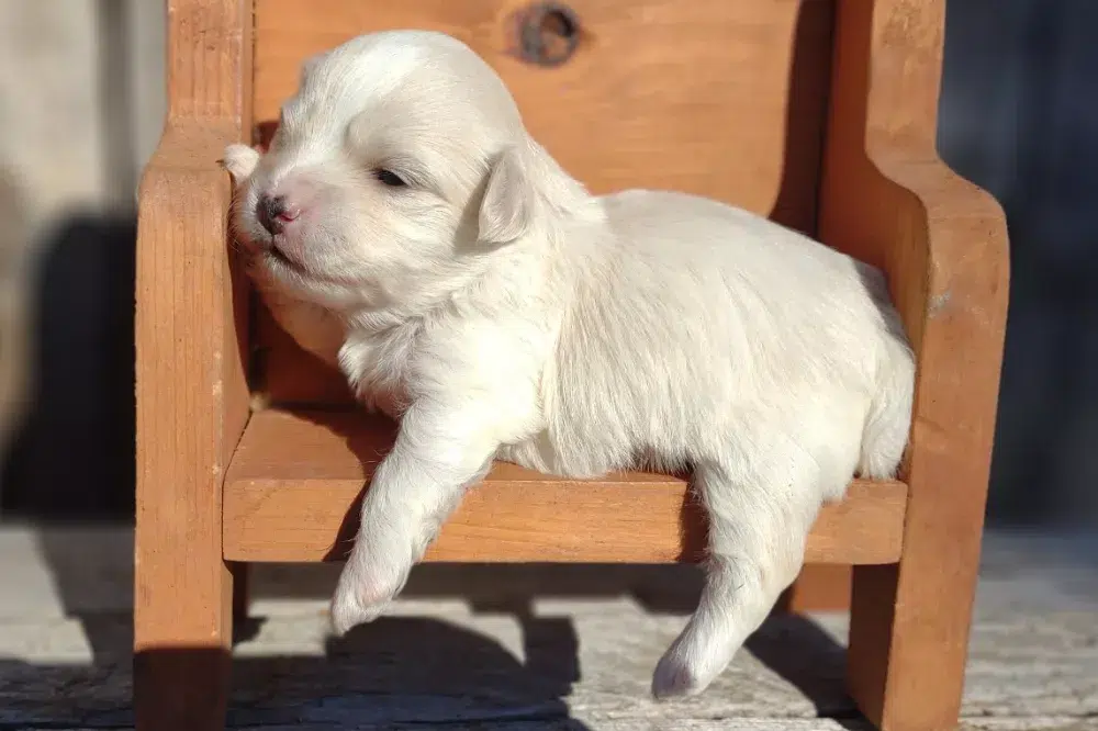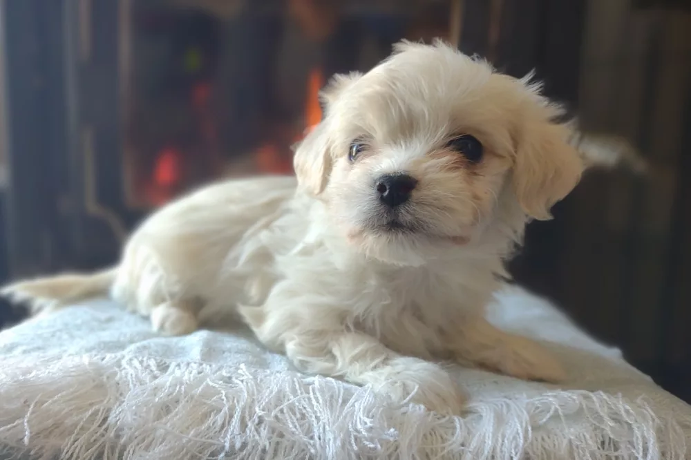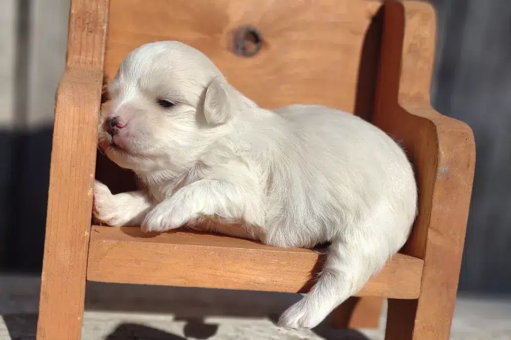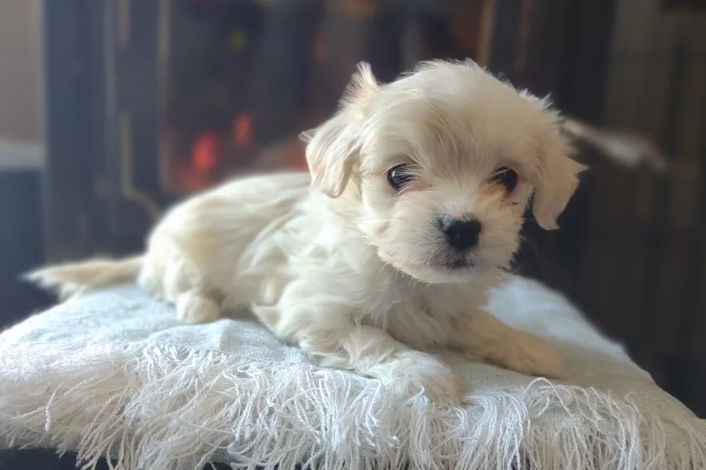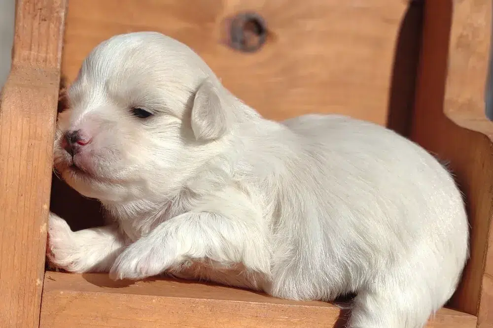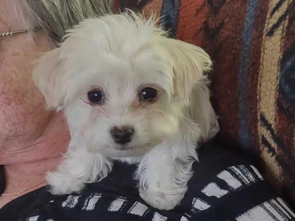 Taffy was the second-born of her litter and she was born at a healthy average-size for a newborn Havamalt puppy! She was happily nursing from her mama within 14 minutes of birth. She has been gaining weight steadily since birth, and is currently thriving! Taffy arrived looking like a solid white puppy, but it became evident fairly quickly that she is white and cream. Our best guess is she will stay white & cream as she matures. Because Mama is a Havanese, we can only make an educated guess. After all, Havamalts are like a box of chocolates! You never know what you are gonna get! Taffy has a lavender collar so you can easily pick her out in pictures and videos. Taffy's personality test revealed that she has a Gentle-Cooperative personality, which is exactly what we have guessed for a while now based on observing her with her litter mates and our family.