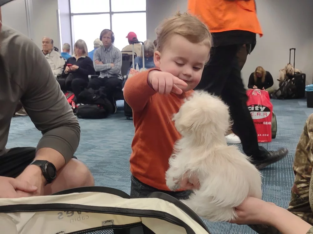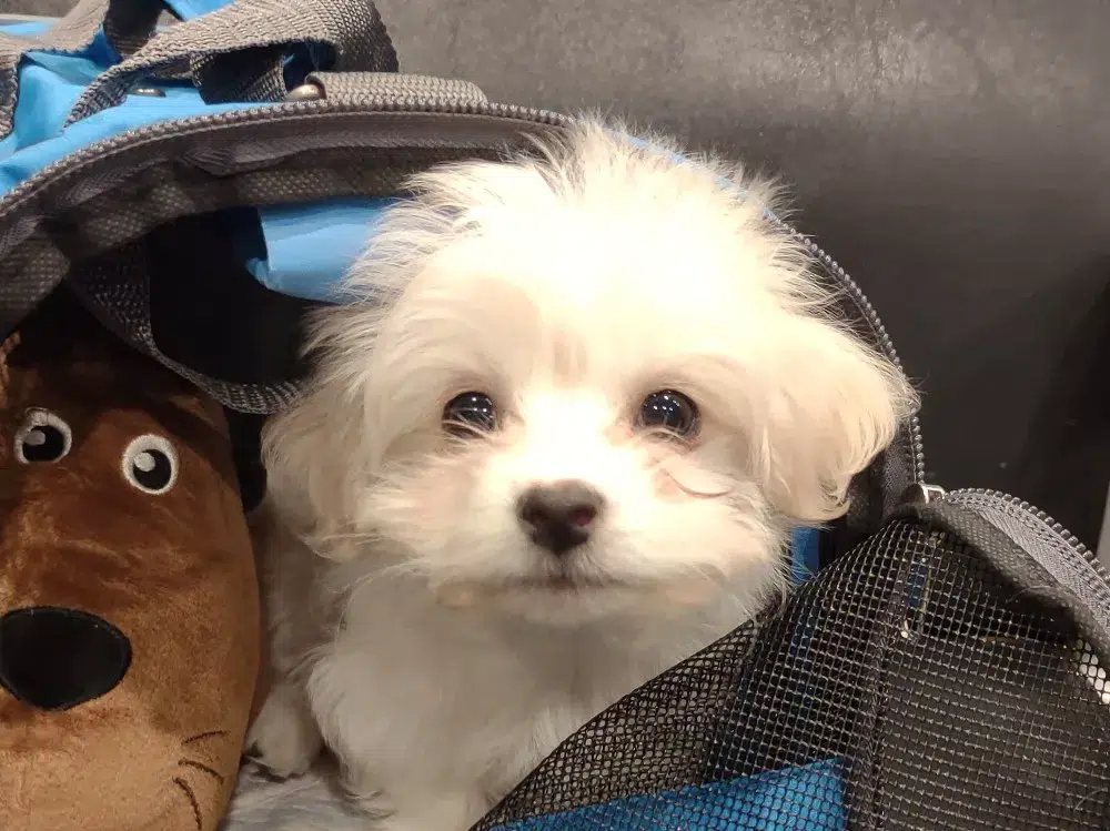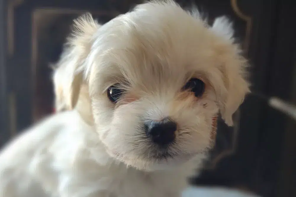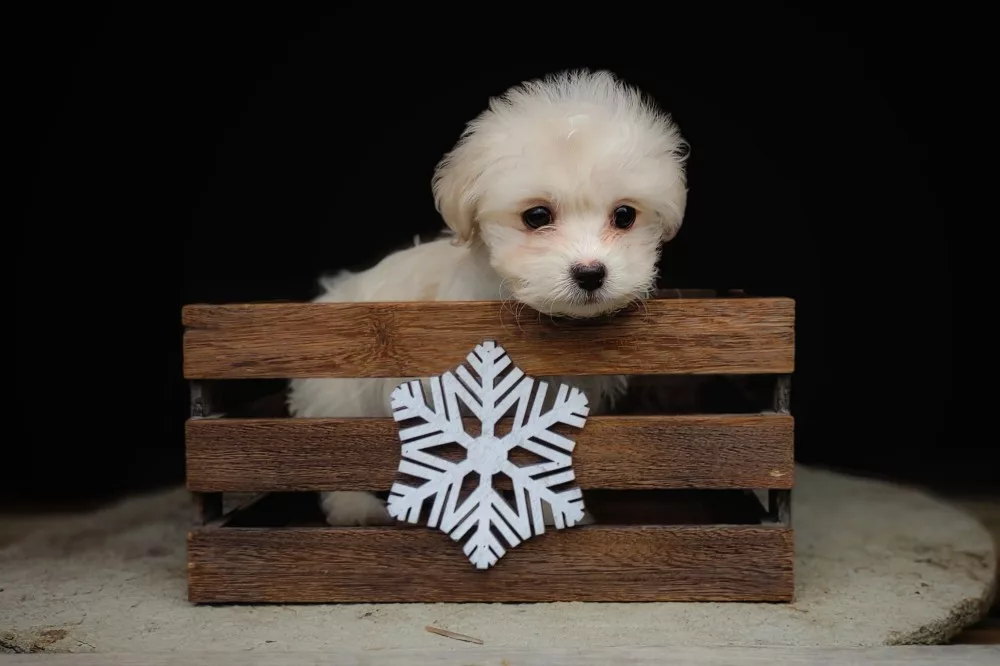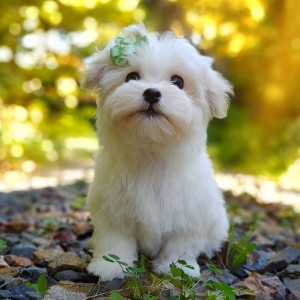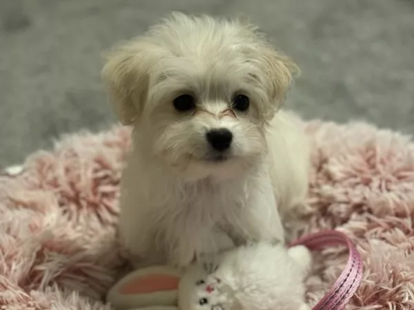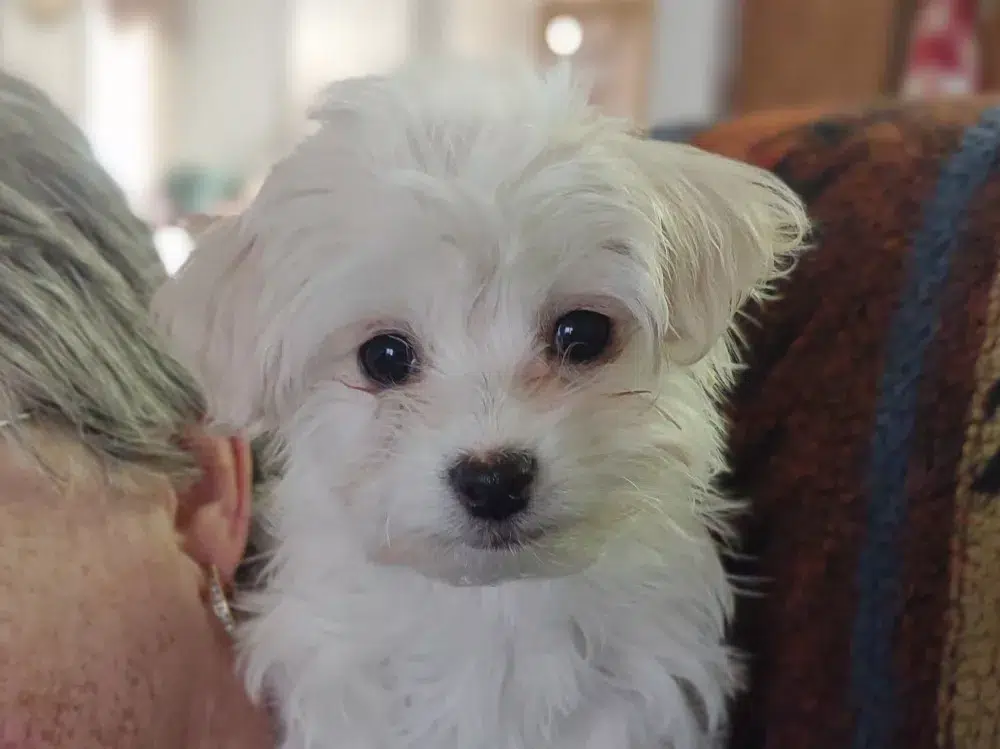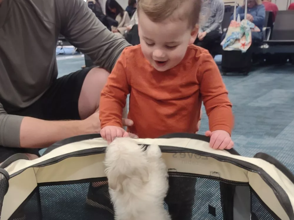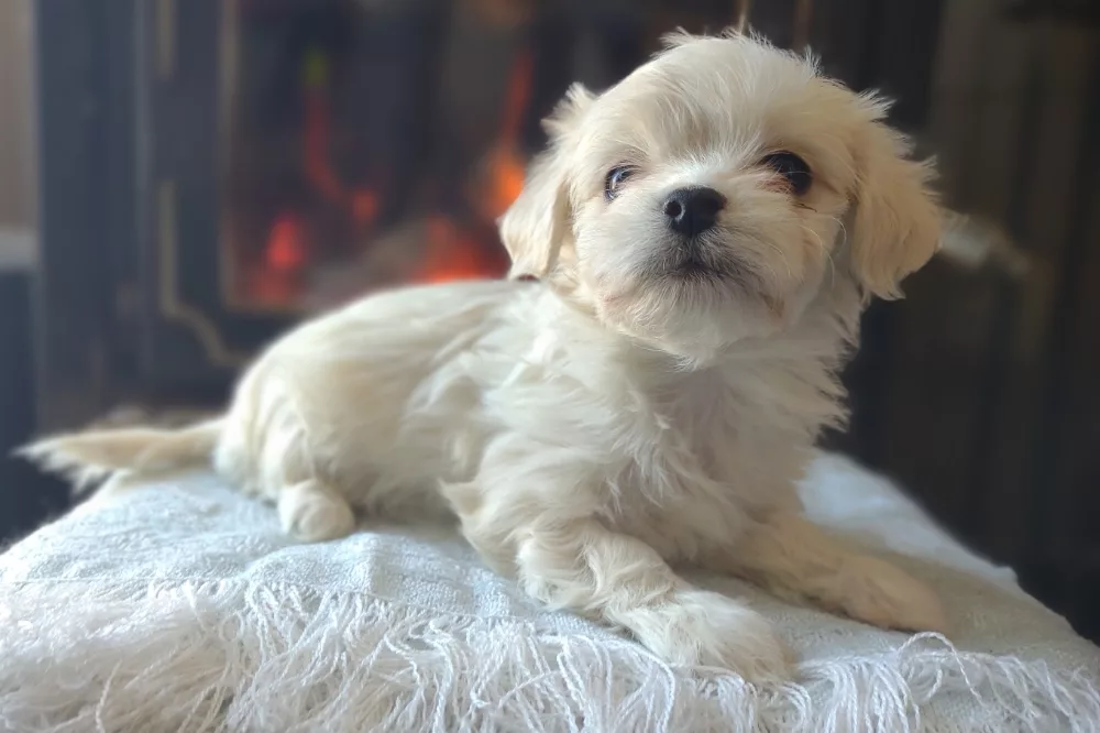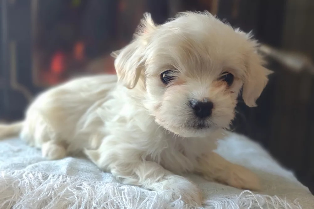 Taffy was the second-born of her litter and she was born at a healthy average-size for a newborn Havamalt puppy! She was happily nursing from her mama within 14 minutes of birth. She has been gaining weight steadily since birth, and is currently thriving! Taffy arrived looking like a solid white puppy, but it became evident fairly quickly that she is white and cream. Our best guess is she will stay white & cream as she matures. Because Mama is a Havanese, we can only make an educated guess. After all, Havamalts are like a box of chocolates! You never know what you are gonna get! Taffy has a lavender collar so you can easily pick her out in pictures and videos. Taffy's personality test revealed that she has a Gentle-Cooperative personality, which is exactly what we have guessed for a while now based on observing her with her litter mates and our family.